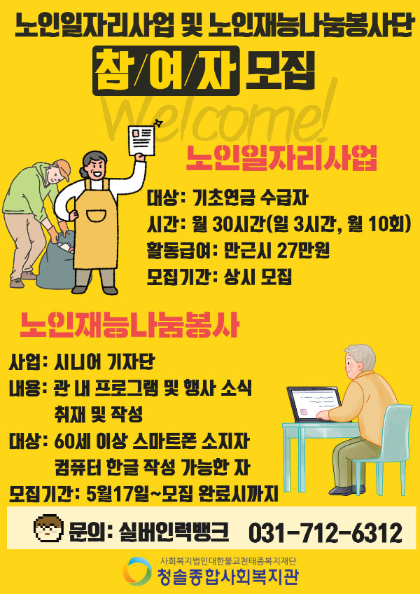 노인일자리에 대한 관심과 참여가 필요합니다. 노인들이 사회의 일원으로서 활발히 활동할 수 있도록 많은 지원과 관심 부탁드립니다.